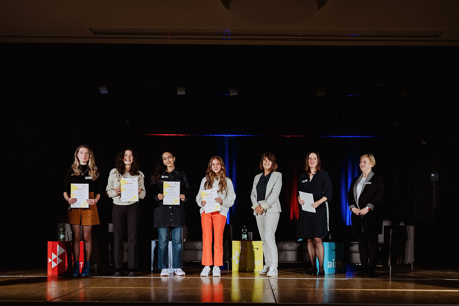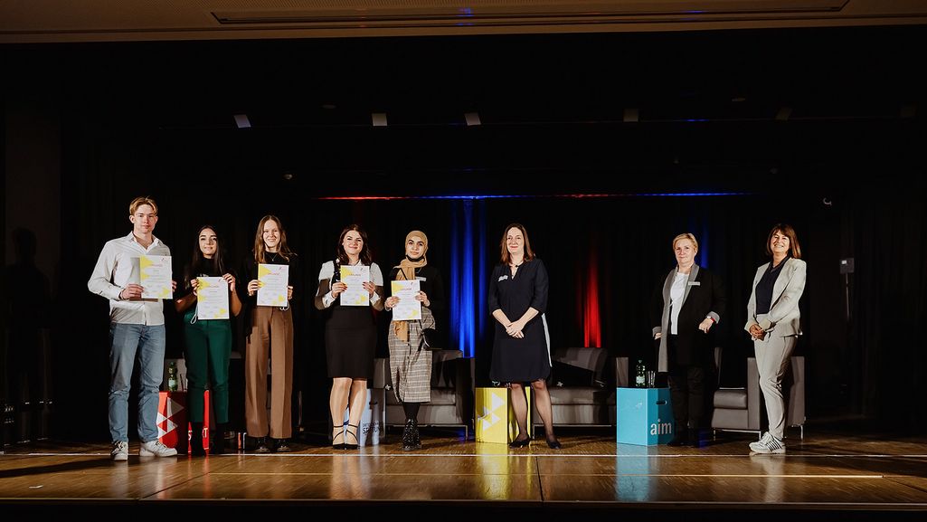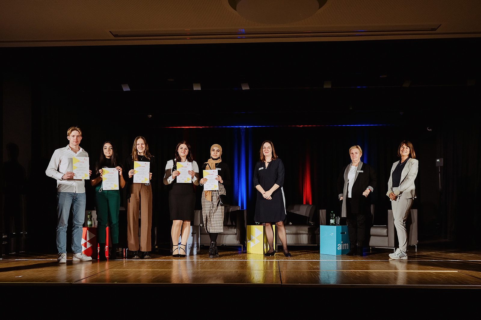 - Silke Lohmiller, Geschäftsführerin der Dieter Schwarz Stiftung, Tatjana Linke, Geschäftsführerin der Akademie für Innovative Bildung und Management (aim), sowie Stefanie Kreyenhop, Geschäftsführerin der START-Stiftung, überreichen die Stipendienurkunden.
