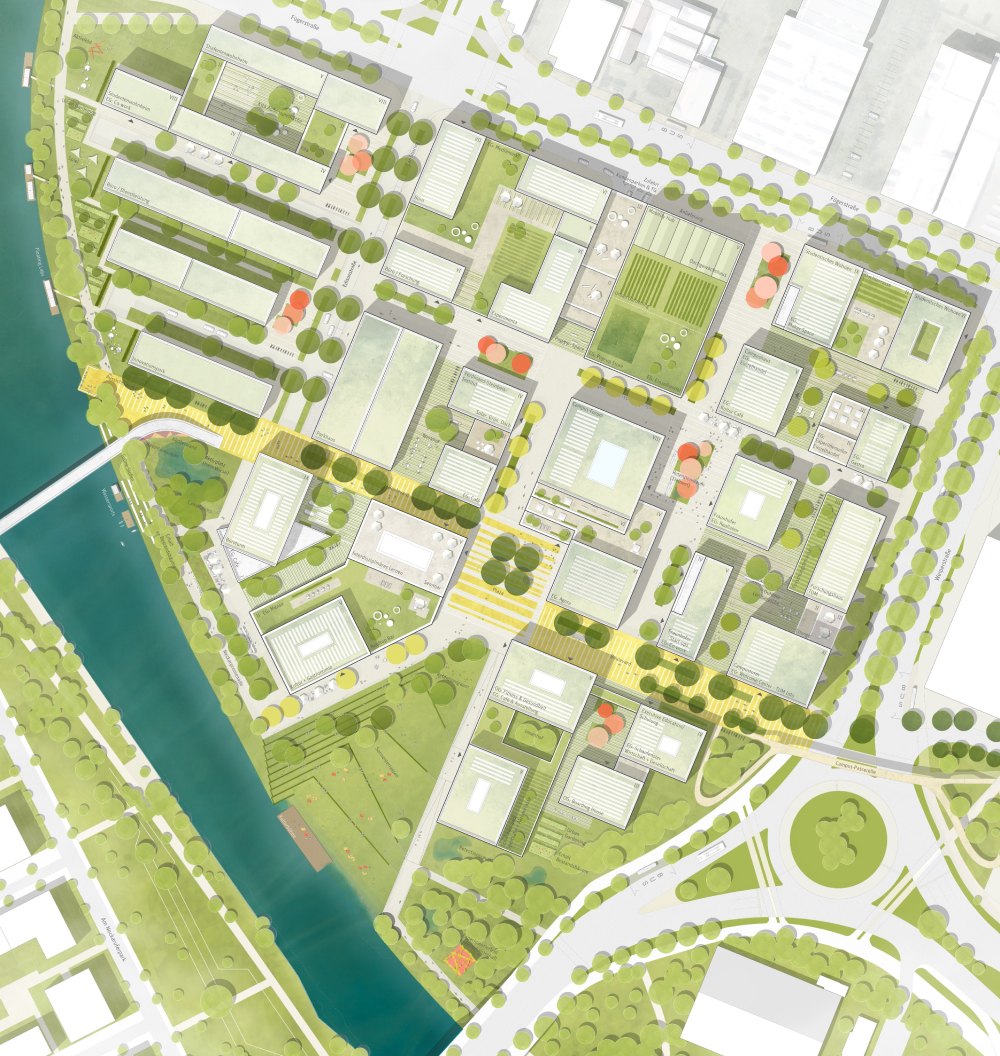 Im Vorfeld des städtebaulichen Wettbewerbs erarbeiteten die zukünftigen Nutzerinnen und Nutzer gemeinsam mit der Stadt Heilbronn die Anforderungen an die Flächen. Neben der Einbettung des neuen Quartiers in die Umgebung spielte beispielsweise auch der Umgang mit dem Neckarufer eine hervorgehobene Rolle in der Bewertung der unterschiedlichen Konzepte.