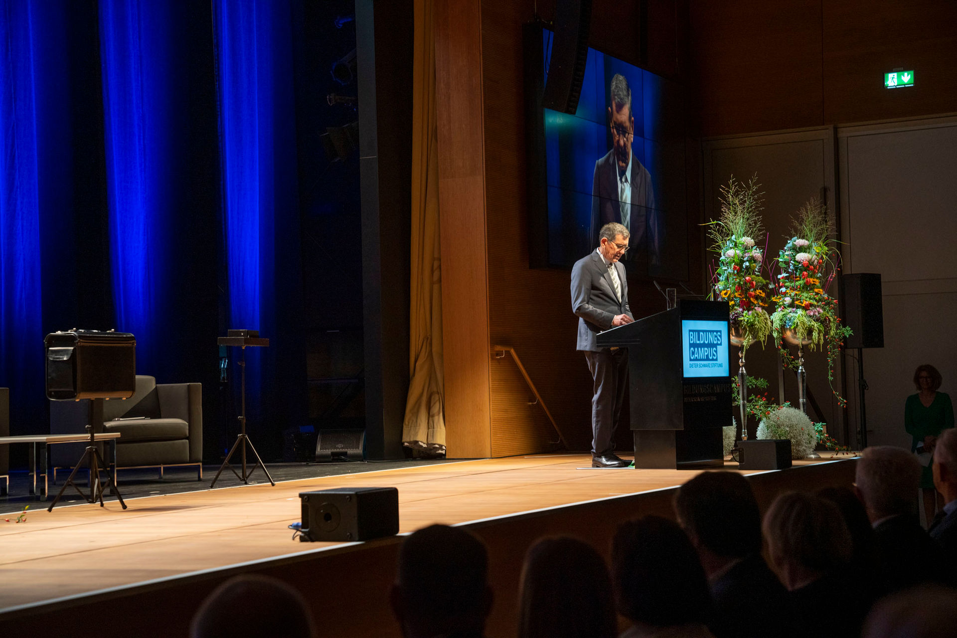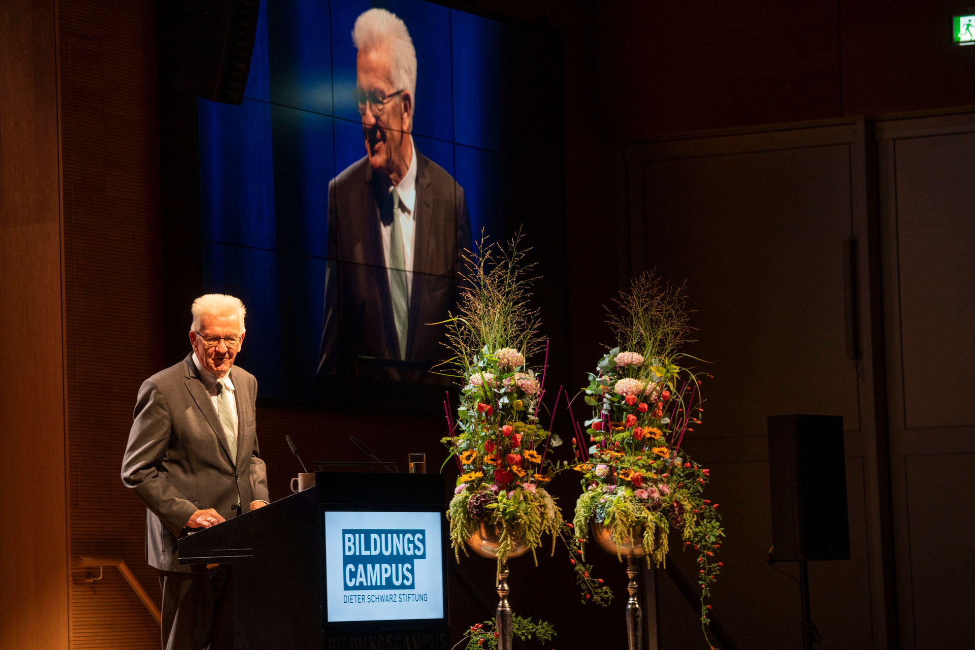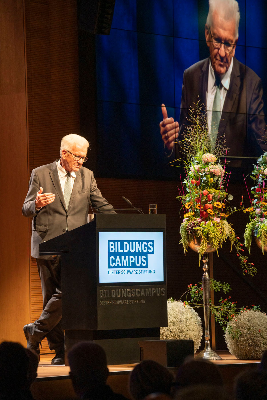 In seiner Rede betonte Ministerpräsident Winfried Kretschmann die Relevanz einer vernetzten Bildungsstätte, wie der beispielhafte Bildungscampus in Heilbronn und wies auf die Bedeutung der Digitalisierung hin: