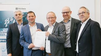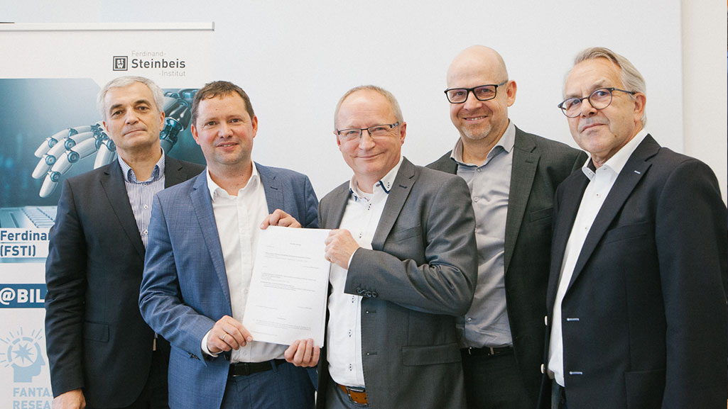 Bildunterschrift (v. l.): Prof. Dr. Michael Auer (Vorstand Steinbeis-Stiftung), Prof. Dr. Heiner Lasi (Leitung Ferdinand-Steinbeis-Institut), Manfred Weigler (Projektleiter Dieter Schwarz Stiftung), Michael Köhnlein (Projektleiter Ferdinand-Steinbeis-Institut), Peter Wittmann (Projektleitung Ferdinand-Steinbeis-Institut)