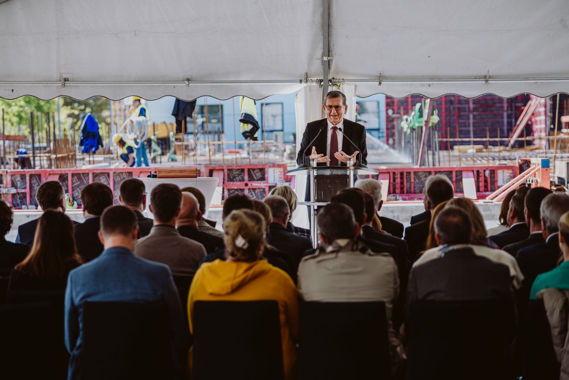 Symbolisch befüllten die Anwesenden Vertreterinnen und Vertreter eine Zeitkapsel mit verschiedenen Erinnerungsstücken. Wirtschaftsministerin Dr. Nicole Hoffmeister-Kraut gab als Symbol für Künstliche Intelligenz einen Roboter in die Kapsel. „Heute legen wir einen wichtigen Grundstein dafür, dass eine der ganz großen innovationspolitischen Visionen der Landesregierung Wirklichkeit wird“, so die Ministerin, die zugleich die Bedeutung der Zukunftstechnologie KI betonte: „KI verspricht enorme Wachstums- und Wertschöpfungspotentiale, wovon wir einen möglichst großen Anteil im Land realisieren wollen.“ Sie freue sich, dass mit dem IPAI ein nachhaltiges KI-Wertschöpfungszentrum mit internationaler Strahlkraft entstehe, von dem das ganze Land profitiere werde.