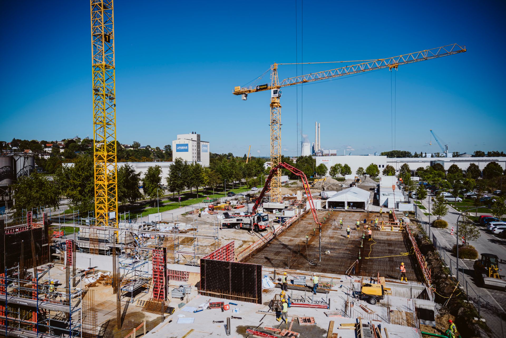 Die Bauarbeiten des zukünftigen viergeschossigen Gebäudes sind schon in vollem Gange und bereits im ersten Obergeschoss angelangt – „Wir haben uns beim Bau selbst überholt“, scherzt Prof. Reinhold Geilsdörfer, Geschäftsführer der Dieter Schwarz Stiftung, bei seinen Erläuterungen zum Ipai. Mit einer Bruttogrundfläche von rund 10.000 m² und deutlich höheren Geschossebenen als die vorgelagerten Gebäude ist es das größte Gebäude in dieser Reihe. Es wird sich auch durch die auffällige Fassadenbegrünung und einen zentralen Haupteingang im Norden für das Besucher- und Schulungszentrum von den übrigen Gebäuden abheben. Die Energietechnik ist absolut zeitgemäß und wird aus bestehen Luft-Wärmepumpen, über die das Gebäude beheizt, gekühlt und belüftet wird. Durch die PV-Anlage wird eine klimafreundliche und effiziente Kühlung des Gebäudes sichergestellt.