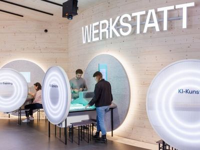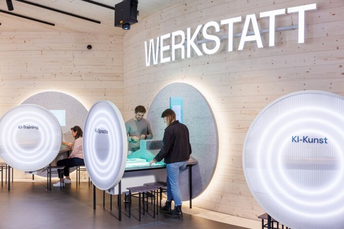 An sechs Mitmachstationen im Bereich „Werkstatt“ steht das praktische Ausprobieren von KI im Mittelpunkt. Hier werden Gedichte oder Kunstwerke kreiert, ebenso werden Grenzen von KI-Anwendungen erfahrbar. Getreu des Mottos „The source of AI is human“ bleibt der Mensch auch in diesem Ausstellungsbereich die treibende Kraft, nutzt KI als Werkzeug und kann die ko-kreativ geschaffenen Werke digital mit nach Hause nehmen.