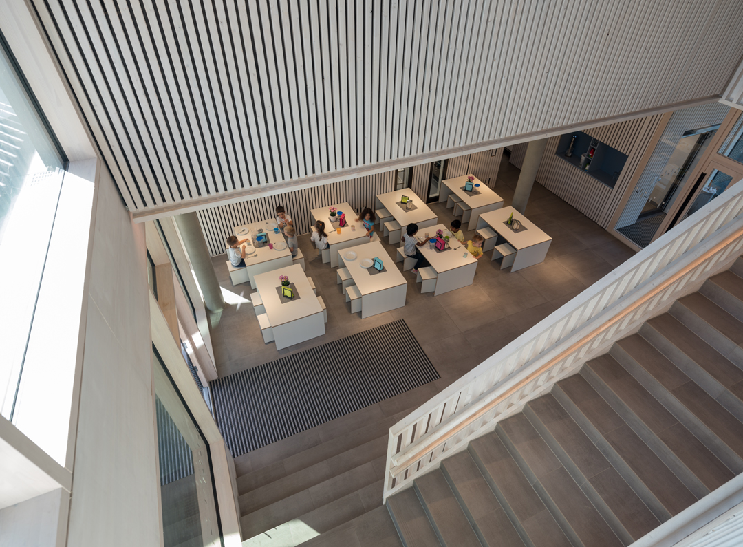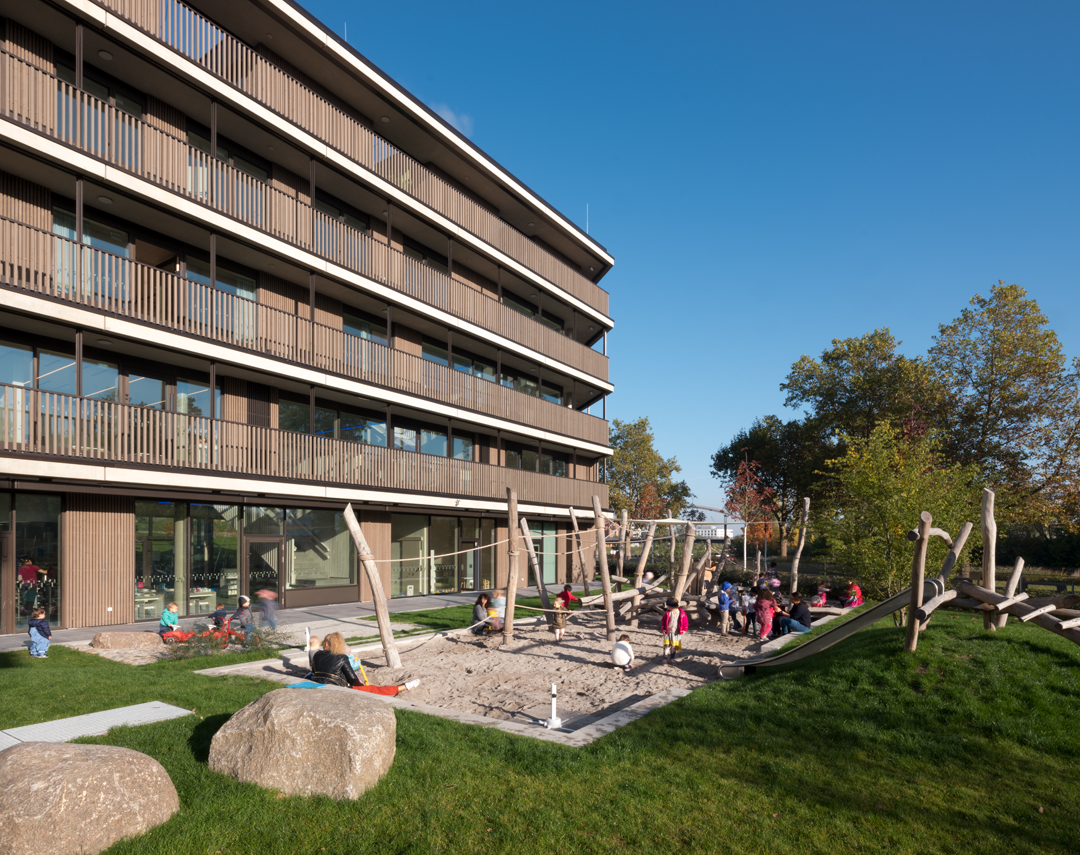 Seit Oktober 2018 wird die „Kindertagesstätte Neckarbogen“ von der Stadt Heilbronn betrieben, das zehn Kita-Plätze für Angehörige des Bildungscampus bereit hält. Das Betreuungsangebot richtet sich an Kinder im Alter von 6 Monaten bis 6 Jahren. DIe „Kindertagesstätte Neckarbogen“ wird insgesamt ca. 85 Kinder aufnehmen, denen sich in einer von der Natur geprägten Architektur in Innen- und Außenflächen viele Möglichkeiten zum Spielen und Toben bieten. Im Atrium befindet sich eine Spiellandschaft mit Treppen und Rutschen, Garten- und Sandloggien, Bäumen und Terrassen sowie Sitzinseln. Das Raumkonzept mit Funktionsräumen ermöglicht offene Gruppen. Die Betreuungszeiten der „Kindertagesstätte Neckarbogen“ liegen zwischen 7 und 18 Uhr.